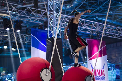Un concursante en el puente giratorio de 'Ninja Warrior'