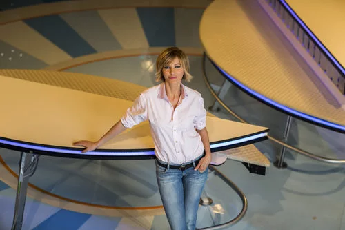 La presentadora Susanna Griso posa en el plató de 'Espejo público'. Aparece con una mano en el bolsillo y la otra apoyada en una mesa.