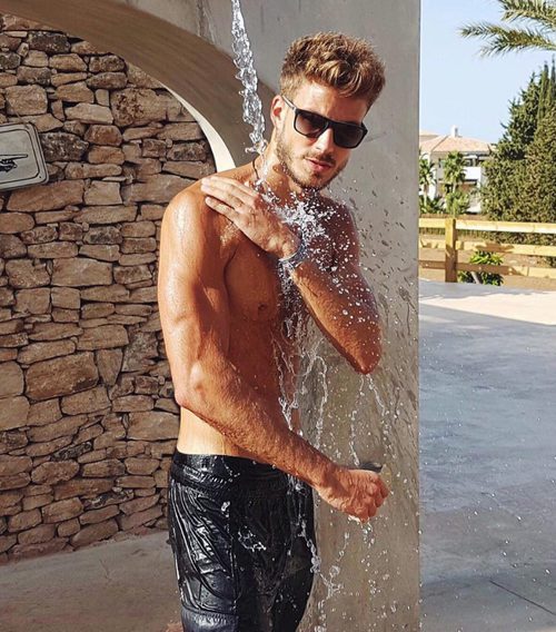 El concursante de 'Supervivientes 2017' posa para una foto en bañador mientras le cae un chorro de agua, pero se deja las gafas de sol.