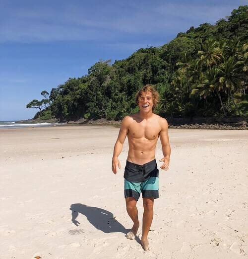Únicamente con el bañador puesto y luciendo una melena rubia, André Lamoglia camina por una playa paradisiaca.