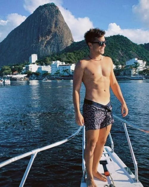 Subido a un barco en plena excursión, el actor André Lamoglia posa en bañador y con gafas de sol en Río de Janeiro.