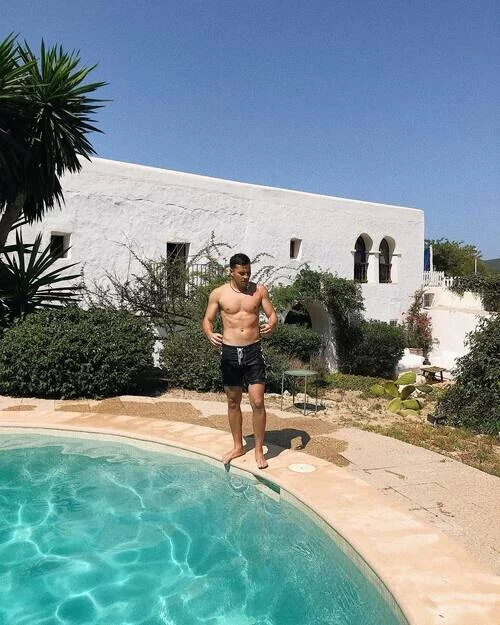 El actor André Lamoglia se prepara en el borde de la piscina para dar un nuevo salto en bañador a su interior.