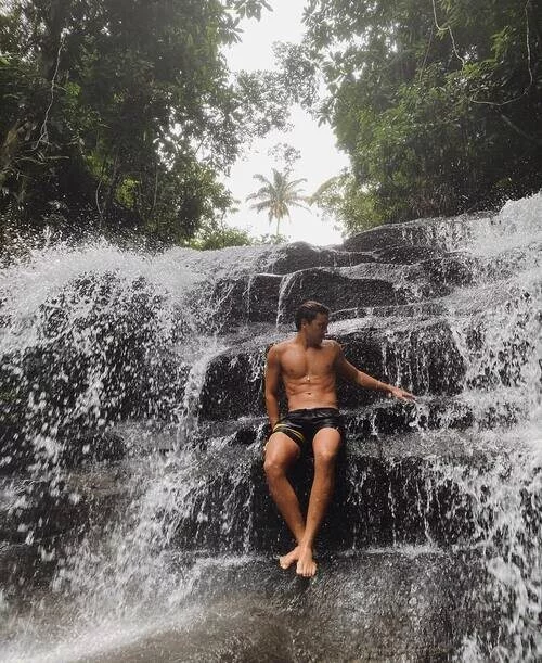 El actor André Lamoglia se sienta en medio de una cascada mientras siente cómo el agua golpea por su espalda.