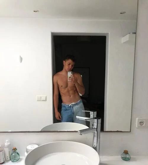 El actor André Lamoglia se hace un selfie con el torso al descubierto en el espejo del baño, apoyado sobre el marco de la puerta.
