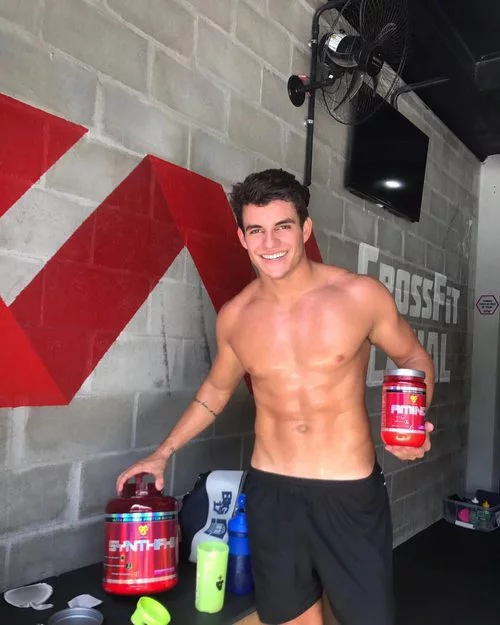 Uno de los gemelos brasileños del intercambio con Elettra Lamborghini, Antonio Rafaski, posa sin camiseta.