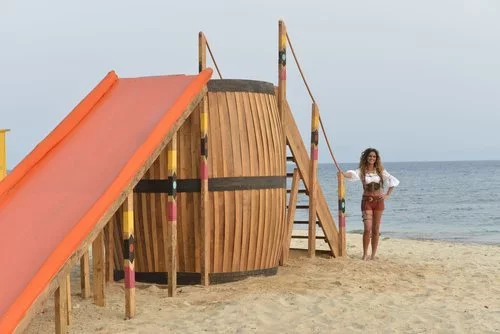 La presentadora Lara Álvarez posa junto al tobogán de la prueba del barro en la Gala 1 de 'Supervivientes 2019'.