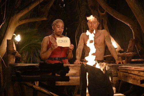 Los dos miembros del equipo de Playa Fatal se plantan ante el fuego para elegir a la persona que no quieren que continúe en el concurso.