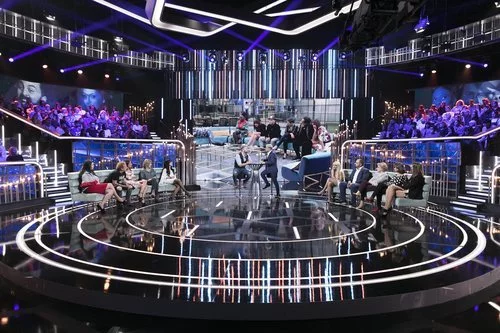 Antonio Tejado frente al plató de 'GH Dúo', con los concursantes expulsados y los defensores, en la Gala 11 del programa.