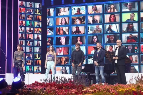 Laura Andrés, Mamen Márquez, Manu Guix, Ivan Labanda y Joan Carles Capdevila, en el escenario de 'OT 2020' tras cantar "Forever Young" junto a los concursantes en la Gala 11.