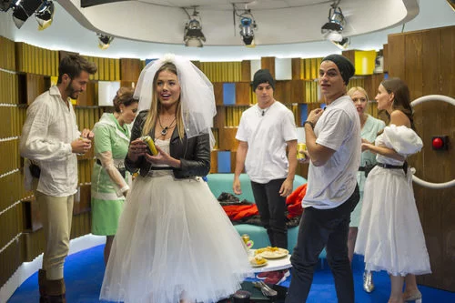 Mientras que los gemelos brasileños, Antonio y Manoel, hacen una broma a los concursantes españoles del reality de Telecinco, Alyson aparece disfrazada de novia.