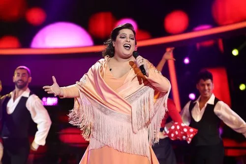 Brays Efe interpreta a María del monte en la gala 12 de 'Tu cara me suena', el tema que interpreta es "Salta la rana"