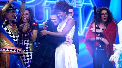 Nia Correia y Agoney se abrazan en la decimotercera gala del concurso producido por Gestmusic, 'Tu cara me suena 9', emitido en Antena 3.