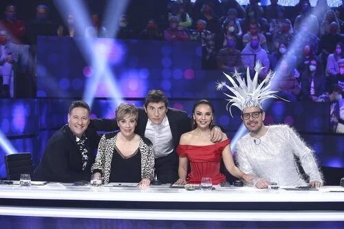 Los miembros del jurado de 'Tu cara me suena 9', Carlos Latre, Chenoa, Àngel Llàcer y Anabel Alonso como invitada, posan con Manel Fuentes, el presentador del concurso de Antena 3 producido por Gestmusic.