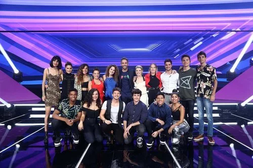 Todos los concursantes de 'Operación Triunfo' en su edición 2018 posan junto al presentador, Roberto Leal, en la última gala que compartirían todos como participantes del concurso.