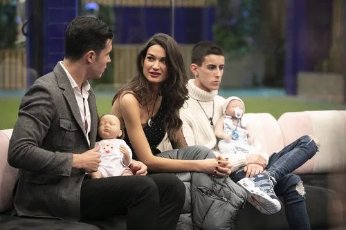 Kiko Jiménez habla con Estela en el salón de 'El tiempo del descuento' mientras él tiene cogido al "hijo" que han tenido juntos en la prueba semanal.