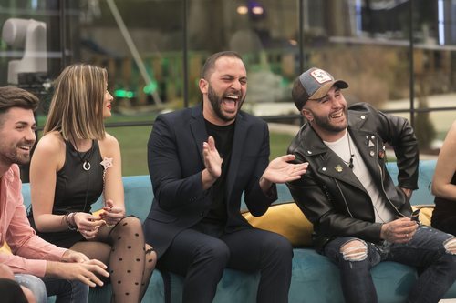 Antonio Tejado junto a Kiko Rivera durante la gala 4 de 'GH Dúo' riendo a carcajadas con lo que dice Jorge Javier.