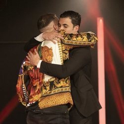 Dinio y Kiko Jiménez se abrazan en la sala de expulsión, en la Gala 5 de 'El tiempo del descuento'