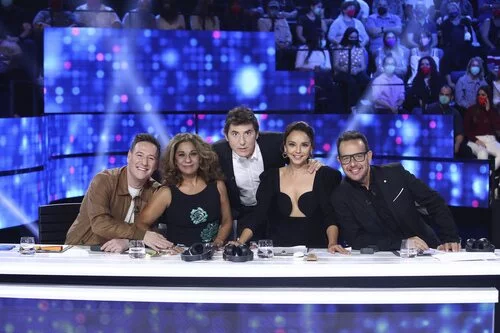 Manel Fuentes, presentador del talent show, posa junto a los integrantes del jurado: Lolita Flores, Chenoa, Àngel Llàcer y Carlos Latre. Todos ellos sonríen en el plató del espacio producido por Gestmusic para Antena 3.