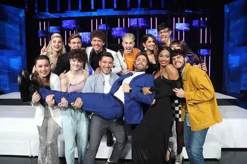 El presentador del talent de TVE posa junto a participantes como Bruno, Anne, Eva y Nia, que lo sujetan en el aire durante la Gala 6.