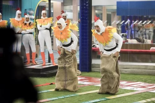 En la séptima gala de 'GH VIP 7', los concursantes participaron en carreras de sacos vestidos de gallinas. En la foto, Estela Grande (ganadora de la prueba) compite contra Gianmarco Onestini.