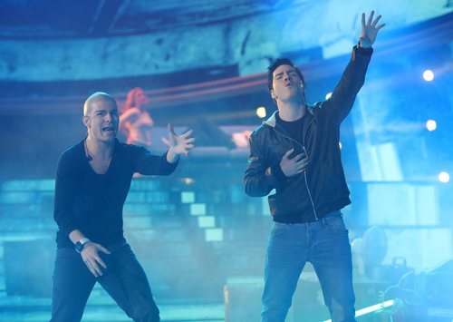 Daniel y Jesús Oviedo, del dúo musical Gemeliers, interpretan el tema "Yo te esperaré", de Cali y El Dandee, en la Gala 7 de 'Tu cara me suena 8'.