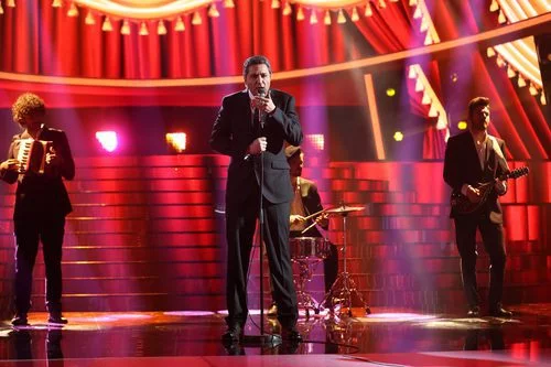 El humorista se mete en la piel del cantante acompañado de la banda y cantando "Dance me to the end of love" con ambientación de teatro.
