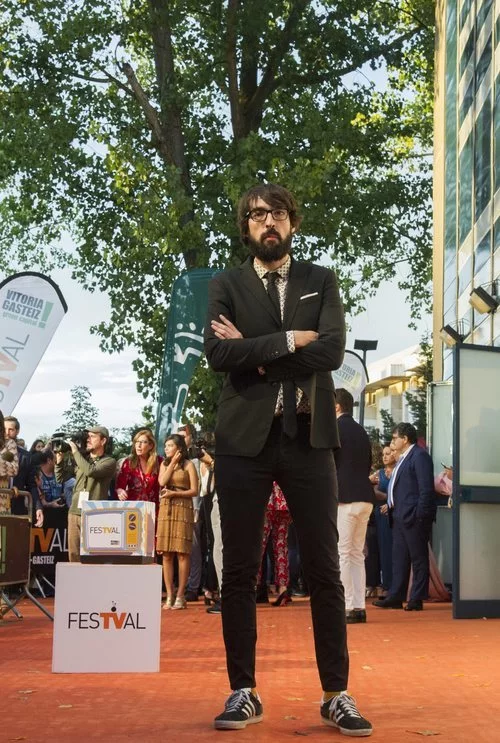 El periodista madrileño posa para los fotógrafos de la gala de clausura de la décima edición del festival de Vitoria en traje pero con deportivas y con un rostro serio.