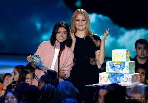 Sarah Hyland y Debby Ryan presentando un premio en la gala de los Nickelodeon's 2016 Kids' Choice Awards