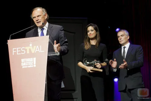 Pedro Piqueras, acompañado de Isabel Jiménez y David Cantero, en la gala de clausura del Festival de televisión de Vitoria.