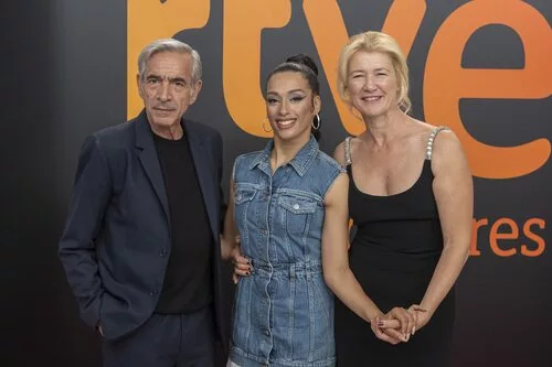 Imanol Arias y Ana Duato posan junto a Chanel Terrero en su gala de despedida previa al Festival de Eurovisión 2022.