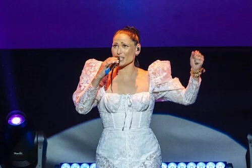 Rosa López, cantando "Europe's living a celebration" durante la despedida de Chanel, ya que fue la representante española en el Festival de Eurovisión 2002, donde obtuvo una séptima posición.