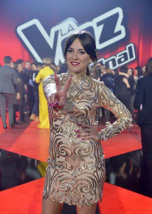 La ganadora de la quinta edición del talent show en plató con el equipo de fondo tras la final de 'La Voz'.