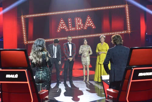 Los coaches, Tania Llasera, Jesús Vázquez y los dos finalistas esperando a conocer el nombre del ganador en la final de 'La Voz 5'.