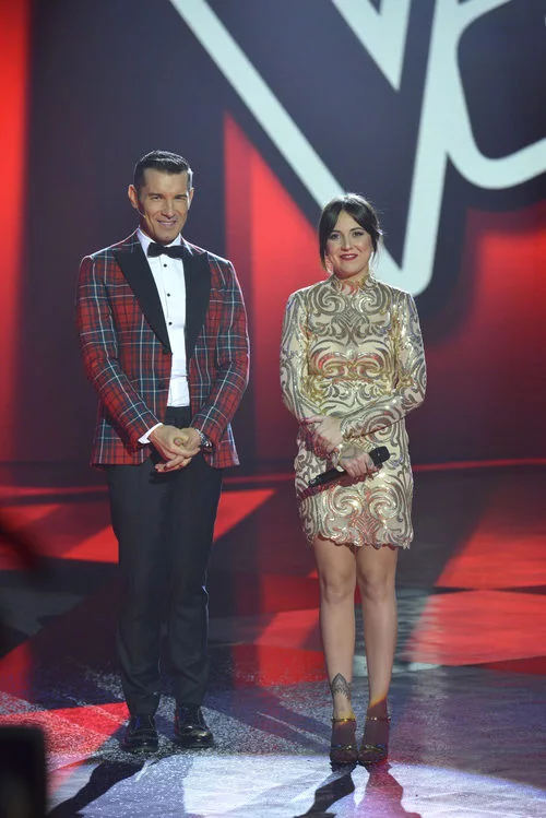 Jesús Vázquez y Alba Gil de pie con el micrófono en la mano en el plató del concurso en la final de 'La Voz 5'