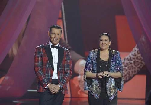El presentador del programa Jesús Vázquez y Niña Pastori juntos en la final del talent show 'La Voz 5'