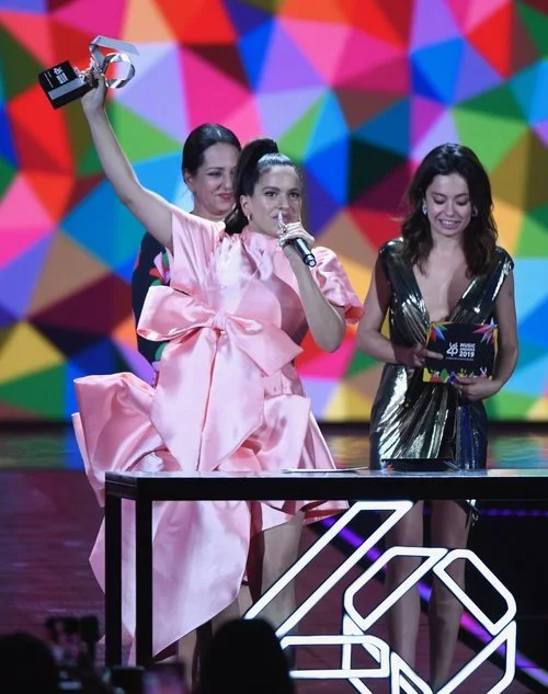 La ganadora de la noche, Rosalía, levanta uno de sus dos galardones de LOS40 Music Awards. Detrás de ella, las actrices Yolanda Ramos y Anna Castillo.