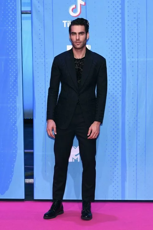 El modelo acudió a la cita de MTV con un sencillo traje de color negro, aunque si se mira con mucho detalle, su vestimenta escondía un llamativo bordado.