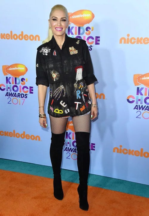 Gwen Stefani viste medias de rejilla y botas altas en su pose para los Nickelodeon's 2017 Kids' Choice Awards.