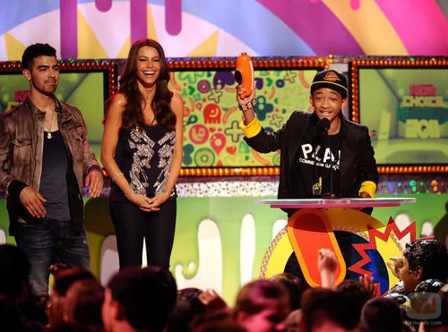 Jaden Smith recoge su premio en los Kids' Choice Awards de la mano de Sofia Vergara, de 'Modern Family' y Joe Jonas.