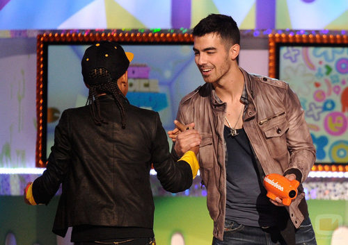 Joe Jonas entregándole su premio a Jaden Smith en la gala de los Kids' Choice Awards 2011.