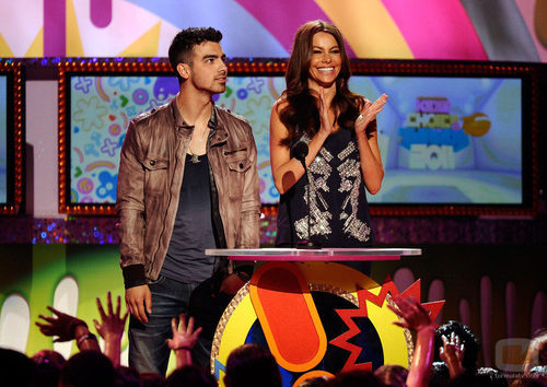 Joe Jonas y Sofia Vergara presentan un premio en la gala de los Kid's Choice Awards.