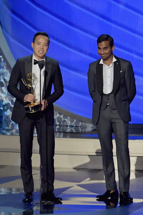 Aziz Ansari y Alan Yang recogiendo su Premio Emmy en 2016