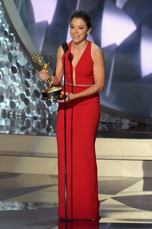 Tatiana Maslany recogiendo el Emmy a la Mejor Actriz de Drama por 'Orphan Black' en la 68 edición de los Premios Emmy 2016.