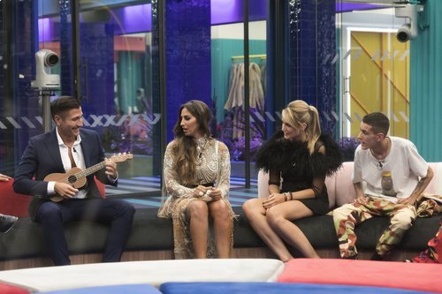 Los concursantes de 'GH VIP 7' Gianmarco Onestini, Noemí Salar, Alba Carrillo y El Cejas en 'GH VIP 7', sentados juntos en el salón en la Gala 1.