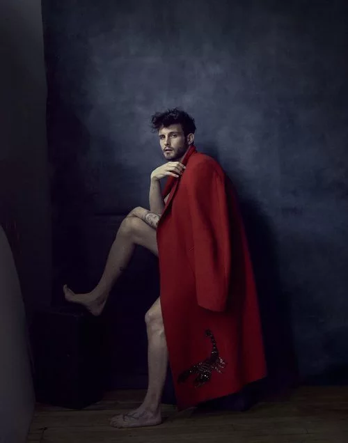 Nico Tortorella posa muy sexy y semidesnudo. El actor está cubierto únicamente por un abrigo rojo y se le pueden ver las piernas por completo.