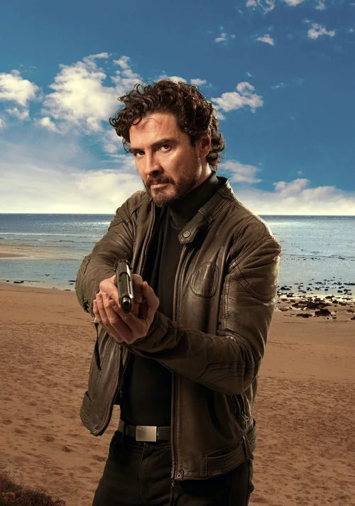 El actor José Manuel Seda posa sujetando una pistola para otra imagen de la nueva serie de Telecinco 'Perdóname Señor'.