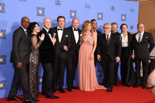 Ryan Murphy, el actor John Travolta, el productor Brad Simpson y los actores Connie Britton and Cuba Gooding Jr., posan en representación del equipo.