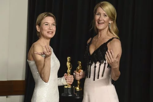 Renée Zellweger, ganadora del Oscar a Mejor Actriz Protagonista, posa junto a Laura Dern, ganadora del Oscar a Mejor Actriz de Reparto.