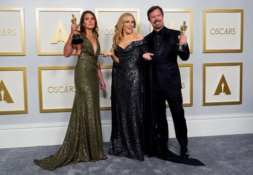 Pippa Ehrlich y James Reed posan con sus estatuillas junto a Marlee Matlin