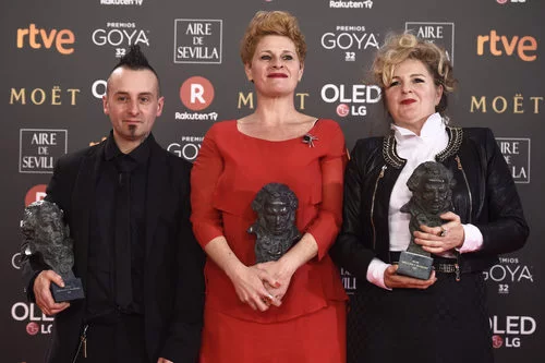 Ainhoa Eskisabel, Olga Cruz, Gorka Aguirre posan con su mejor a Mejor Maquilla y Peluquería en los Goya 2018